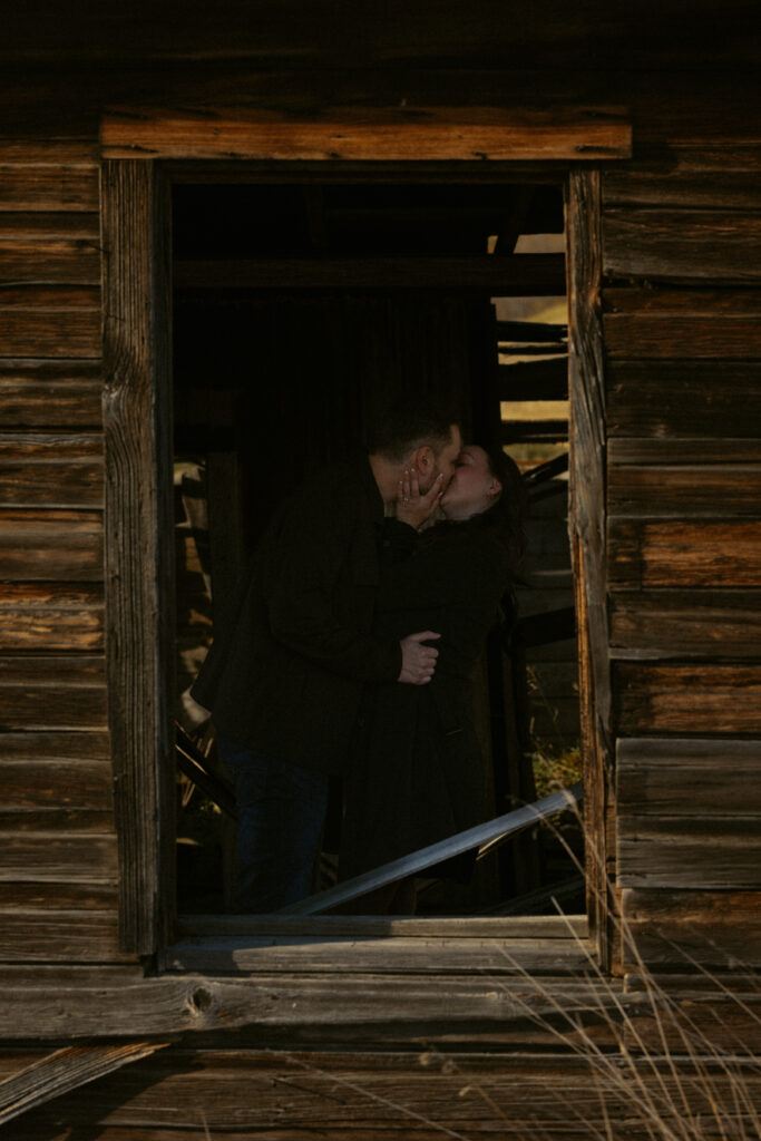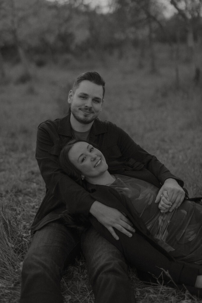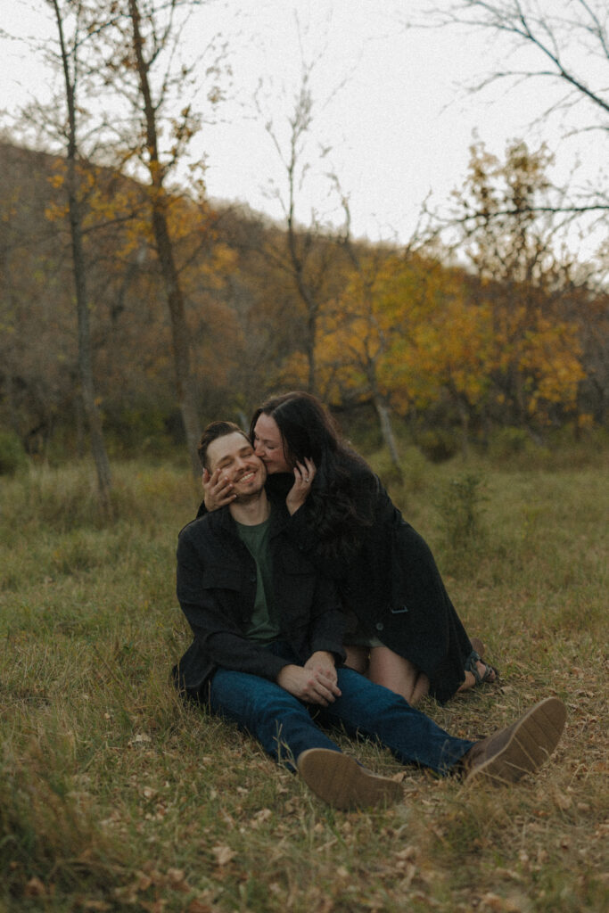 We started their engagement session in true Saskatchewan fashion: wild winds whipping through the fields, enough to make most people call it quits… but not these two. Payton and Eric showed up smiling, ready for anything, and totally trusting the process — which is every photographer’s dream. Eventually, we found a covered spot tucked into the pasture where the wind softened just enough for the cozy, intimate moments to come through.