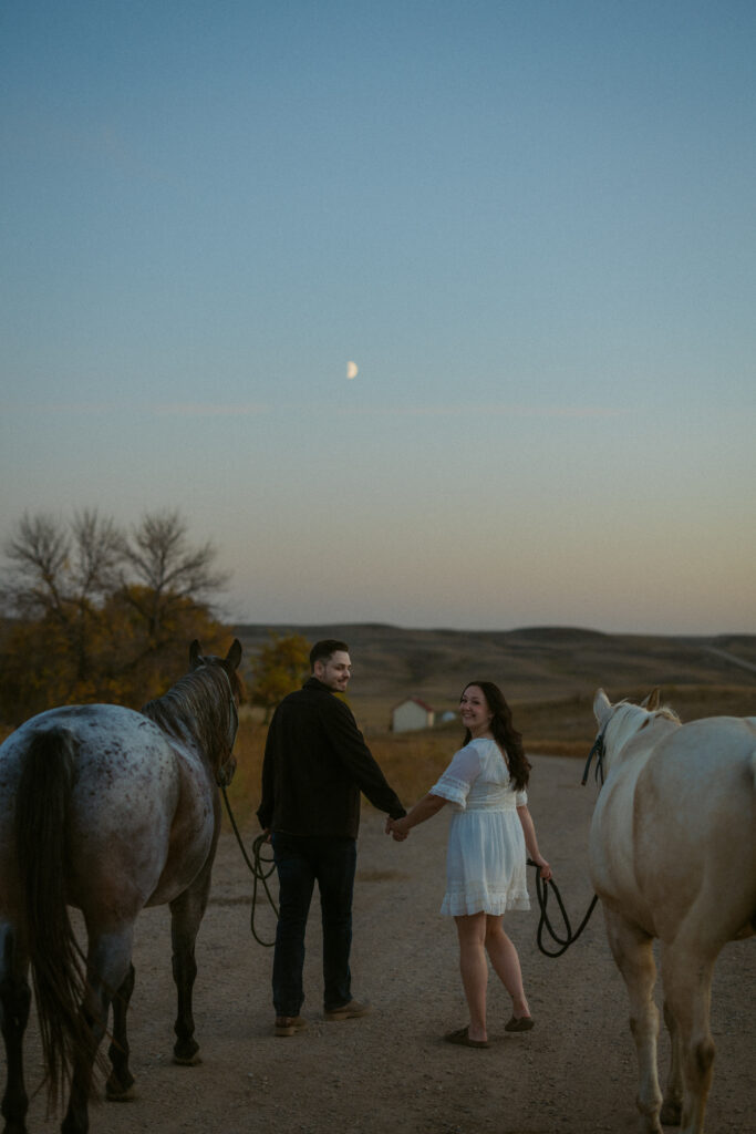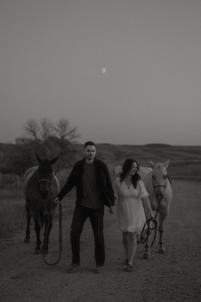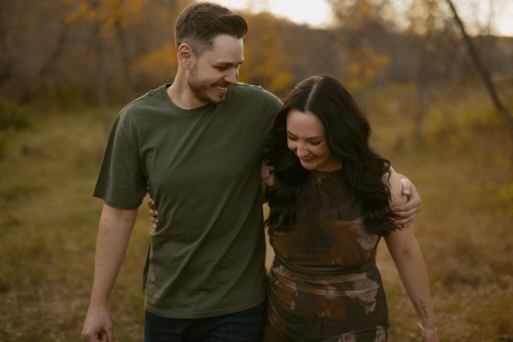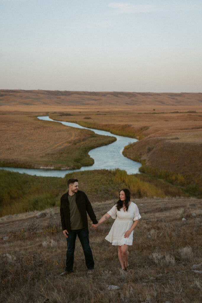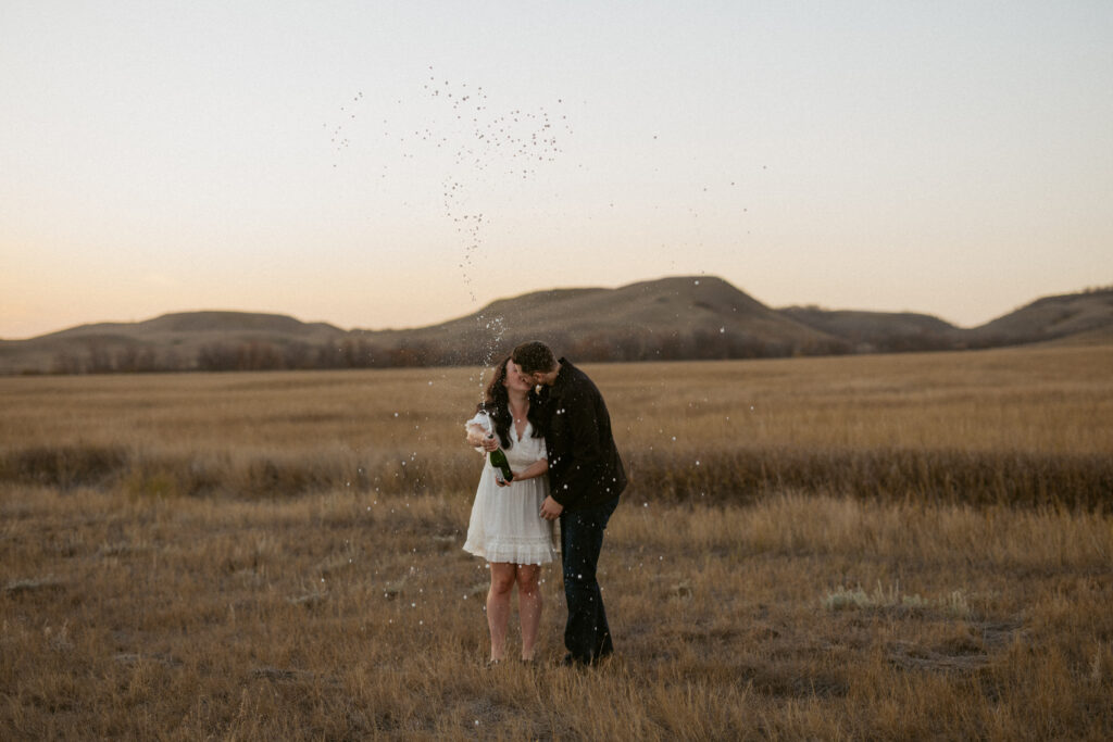 As the evening settled, the wind calmed and the golden light slowly began to pour across the landscape. We popped some Baby Duck (a very Saskatchewan romance move 😂), wandered through the pastures, and let the session unfold naturally — laughing, exploring, slowing down, and celebrating this chapter of their lives.