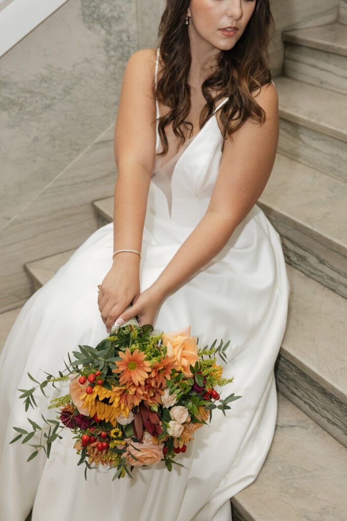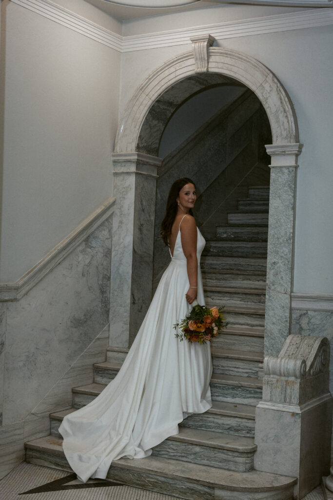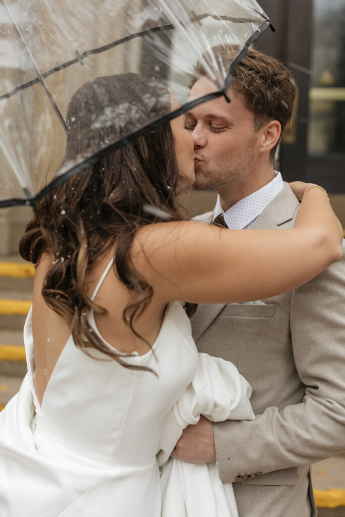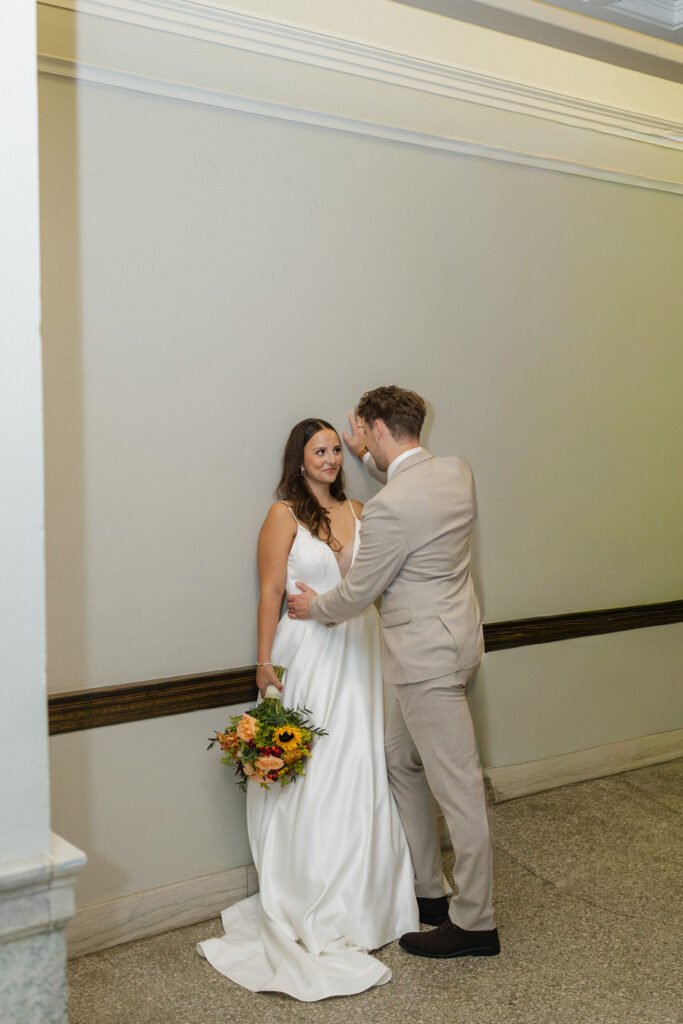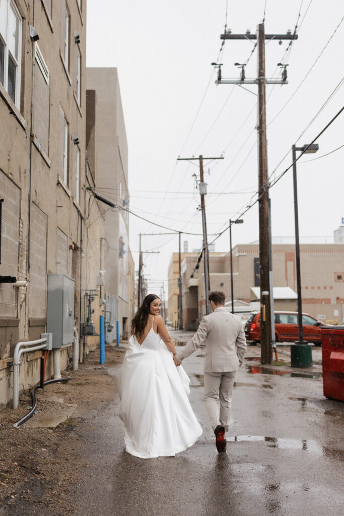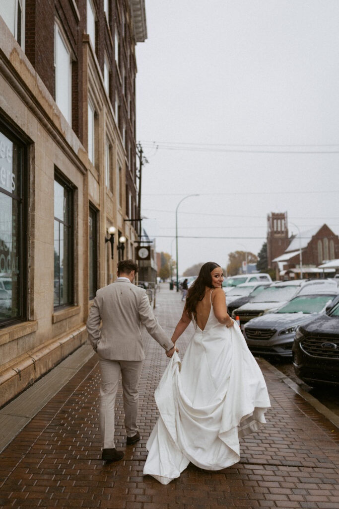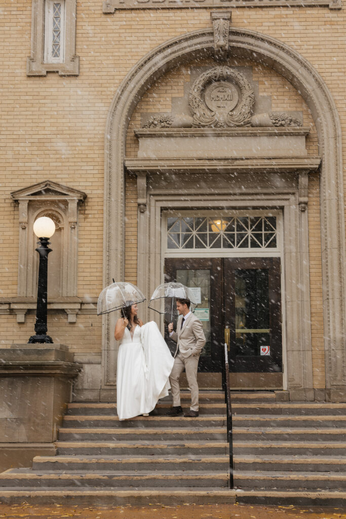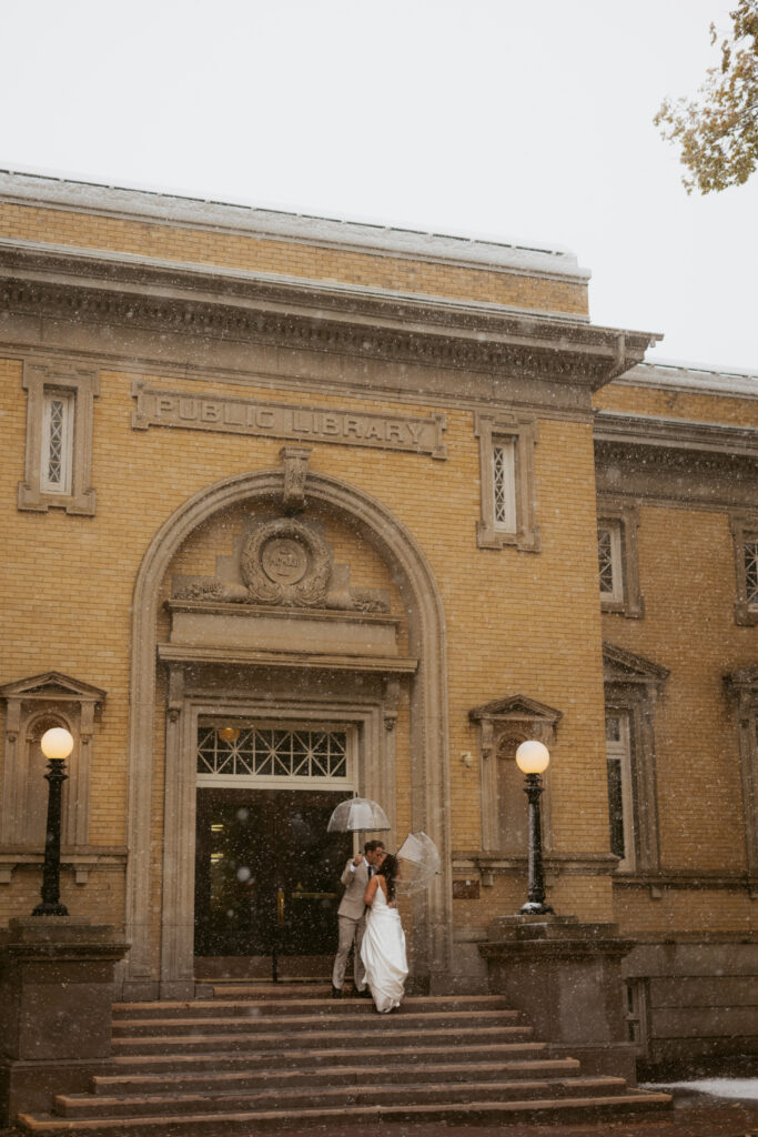 The morning began with Carly and her mom, sisters & niece hanging out in the Temple Gardens Mineral Spa hotel room, slowly getting ready and enjoying visiting until we were to meet up with Tucker for their intimate first look. Of course, the weather did not cooperate, and it was sleeting outside. We decided to tuck away into the Moose Jaw Public Library (one of my fave indoor spots for portraits in town) and captured some editorial style shots here, before heading outside for a few in the fresh snow.